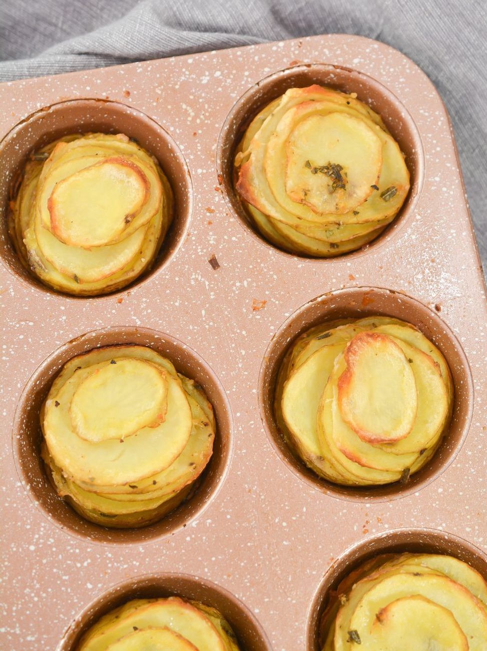Ingredients 8 Gold potatoes thinly sliced 2 Tbsp. Butter unsalted and melted 1 Tbsp. Fresh chopped rosemary 1 tsp. Garlic powder 1 Tbsp. Parmesan cheese Salt and pepper to taste Instructions Preheat the oven to 350 degrees. In a large ...